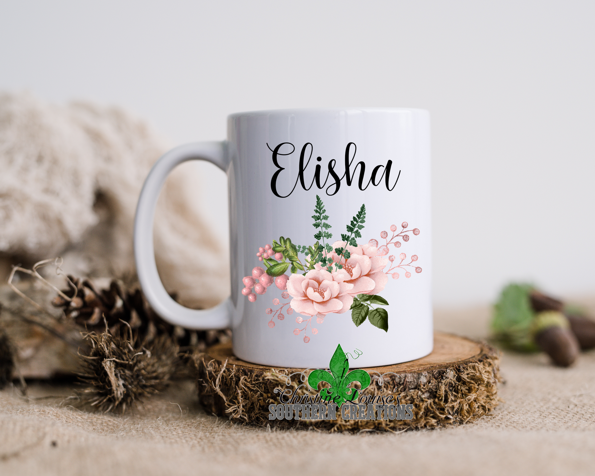 A beautiful bouquet with a personalized with a name, date or word of your choice. This mug is a great way to start your day. This mug is wonderful for drinking your morning coffee or evening tea. Makes Great Gifts!
