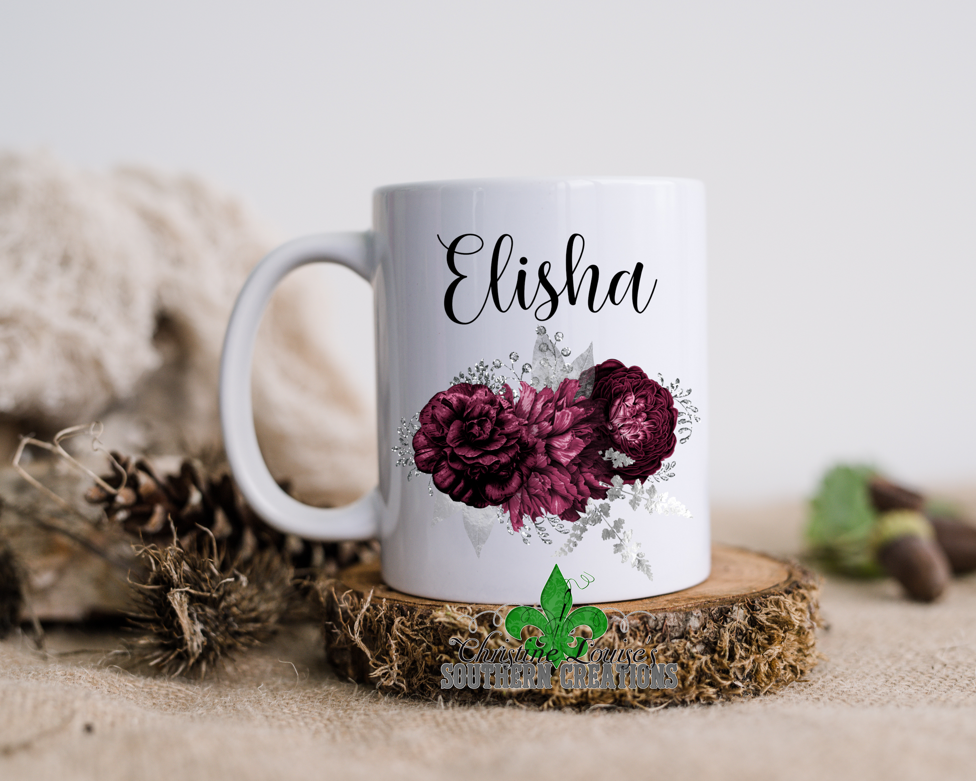 Burgundy And Silver Floral Bouquet Personalized Name Mug