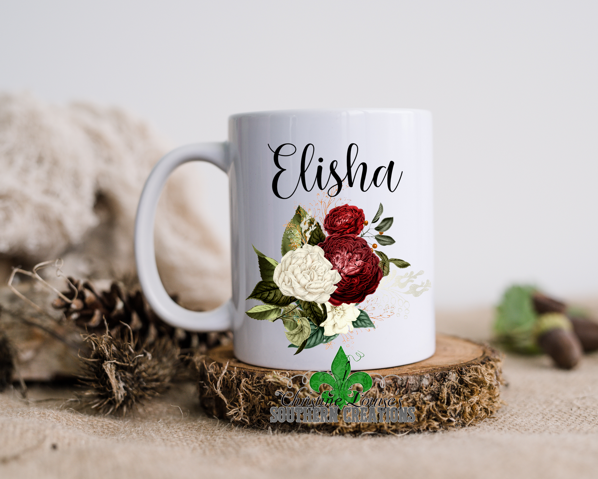 A beautiful bouquet with a personalized with a name, date or word of your choice. This mug is a great way to start your day. This mug is wonderful for drinking your morning coffee or evening tea. Makes Great Gifts!