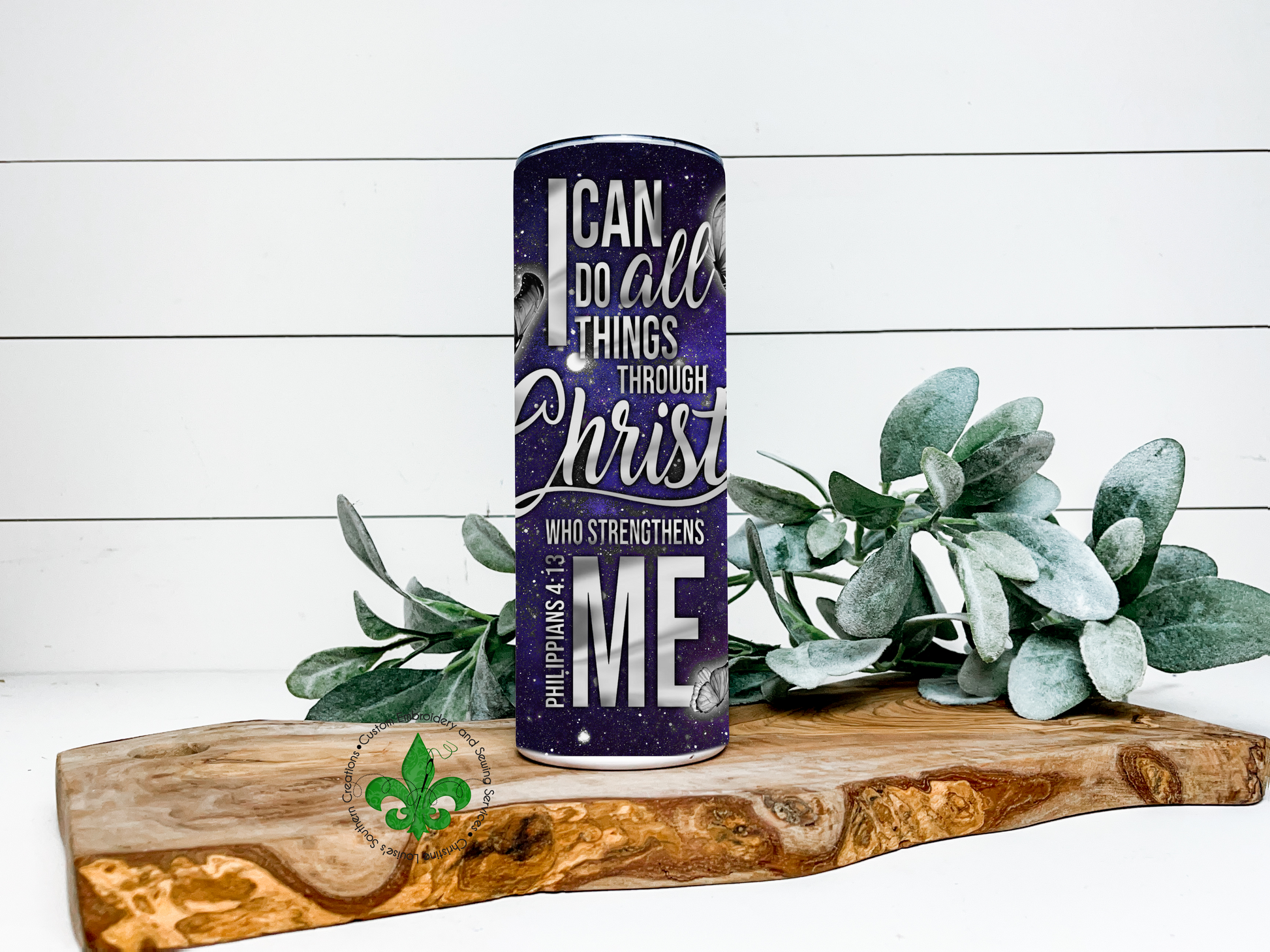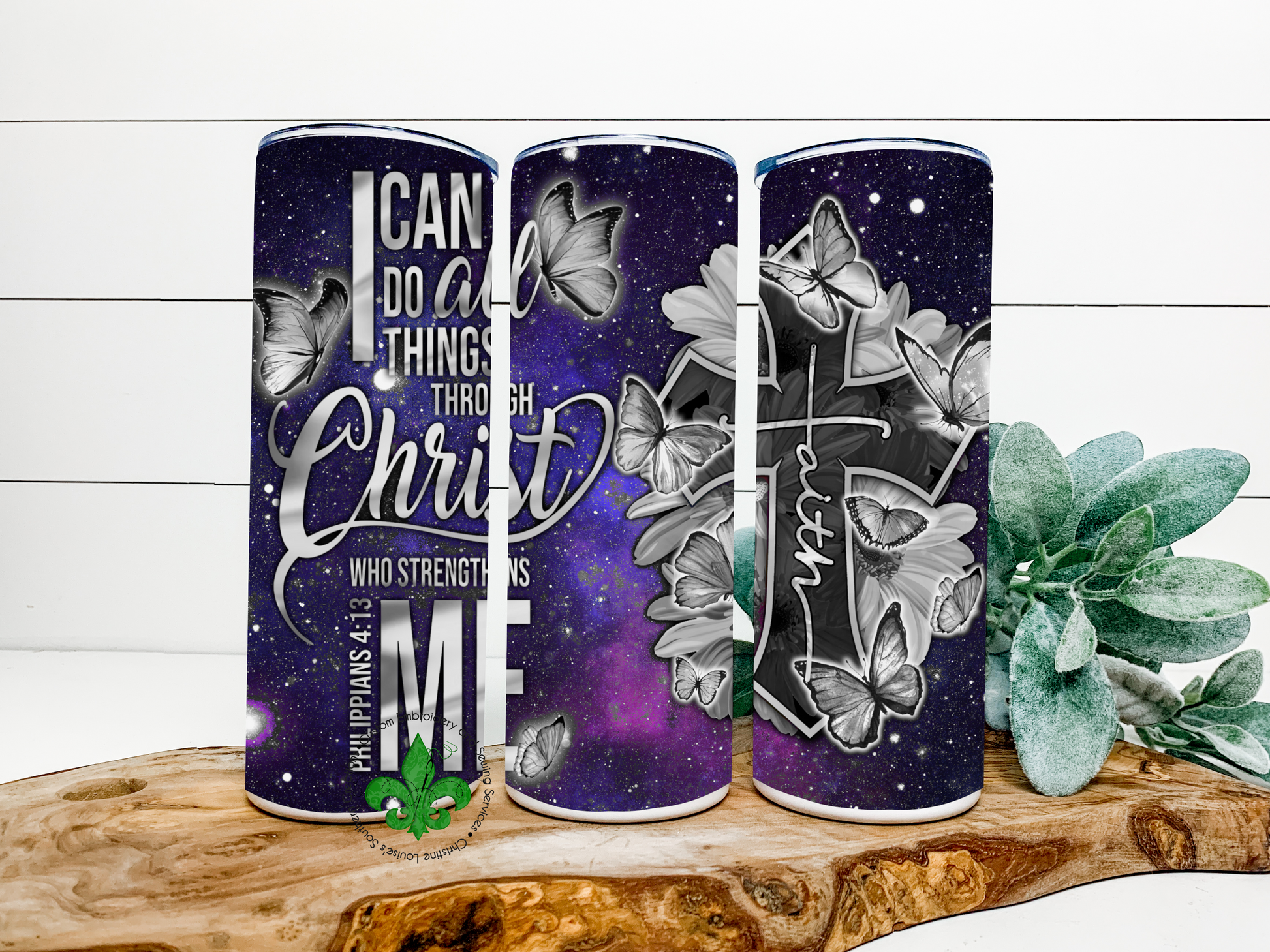 Gray Scale I Can Do All Things Through Christ Faith Tumbler, 20 Oz. Insulated Tumbler with Lid and Straw