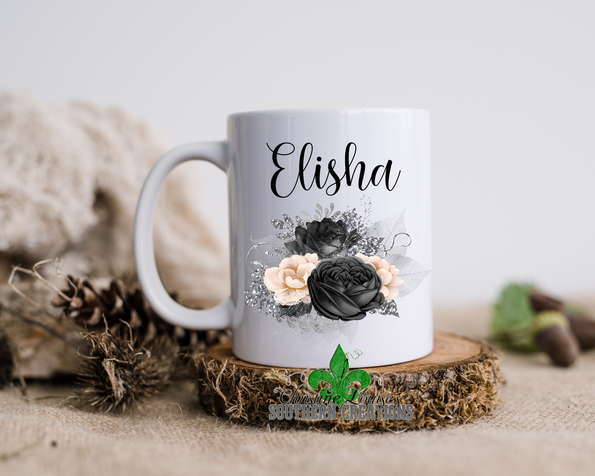 A beautiful bouquet with a personalized with a name, date or word of your choice. This mug is a great way to start your day. This mug is wonderful for drinking your morning coffee or evening tea. Makes Great Gifts!