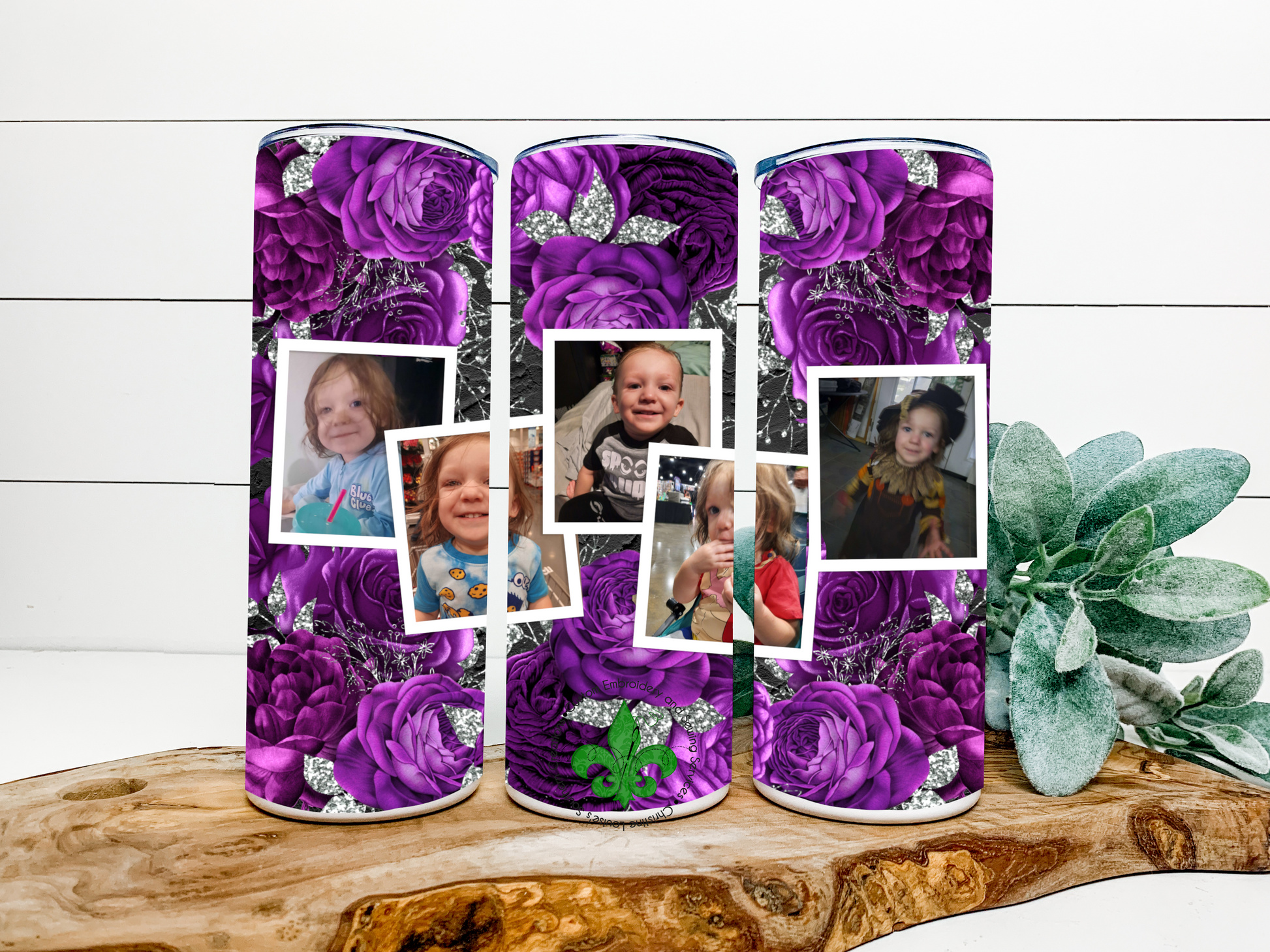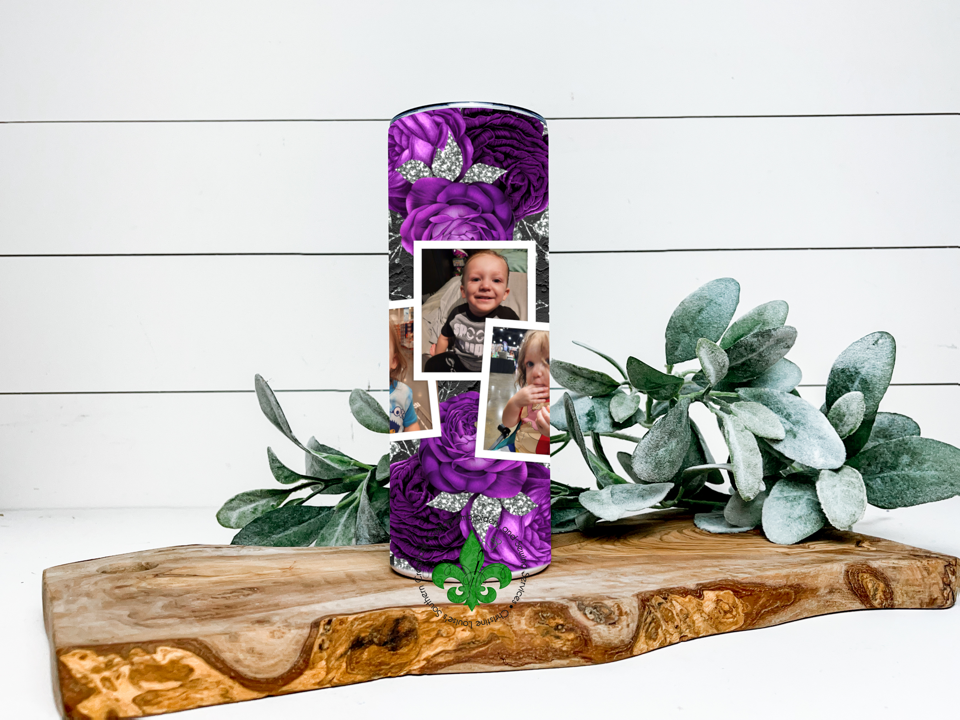 Photo Frame Purple Flowers Personalized Name Tumbler, 20 Oz. Insulated Tumbler with Lid and Straw