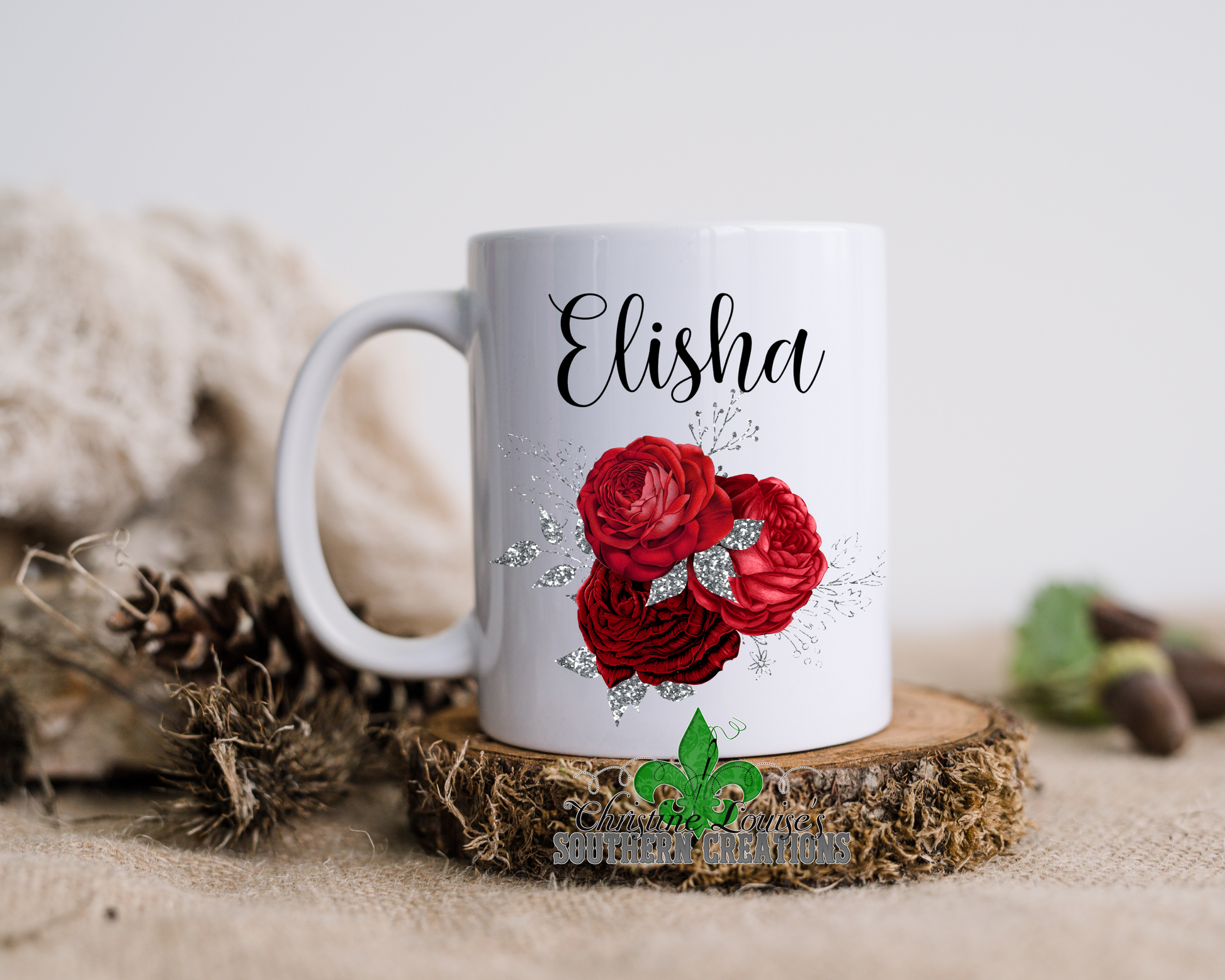 A beautiful bouquet with a personalized with a name, date or word of your choice. This mug is a great way to start your day. This mug is wonderful for drinking your morning coffee or evening tea. Makes Great Gifts!